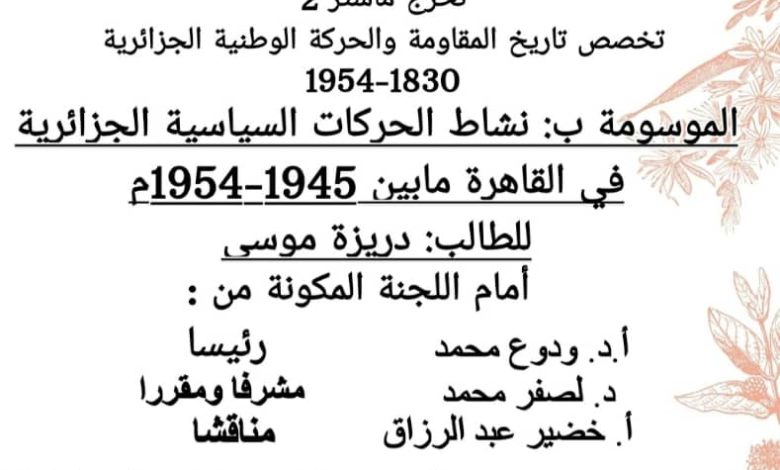 أول مناقشة تخصص ماستر تاريخ تحت عنوان نشاط الحركات السياسية الجزائرية في القاهرة مابين 1945-1954م