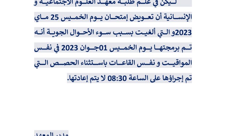 الرئيسية/إعلانات/إعلان عن تعويض إمتحان يوم الخميس 25 ماي 2023 إعلاناتطلبة إعلان عن تعويض إمتحان يوم الخميس 25 ماي 2023 29 مايو 2023 713 أقل من دقيقة 29 مايو 2023 713 أقل من دقيقة اظهر المزيد شاركها فيسبوك تويتر لينكدإن مشاركة عبر البريد طباعة
