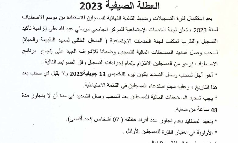 الرئيسية/Slider/إعلان عن موسم الإصطياف لسنة 2023 Sliderأساتذةإعلاناتخدمات اجتماعيةطلبة إعلان عن موسم الإصطياف لسنة 2023 10 يوليو 2023 833 أقل من دقيقة 10 يوليو 2023 833 أقل من دقيقة اظهر المزيد شاركها فيسبوك تويتر لينكدإن مشاركة عبر البريد طباعة
