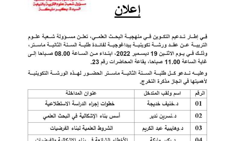 الرئيسية/إعلانات/أساتذة/إعلان عن ورشة تكوينية لفائدة طلبة السنة الثانية ماستر أساتذةأيام تكوينيةإعلاناتطلبة إعلان عن ورشة تكوينية لفائدة طلبة السنة الثانية ماستر 17 ديسمبر 2022 518 أقل من دقيقة 17 ديسمبر 2022 518 أقل من دقيقة اظهر المزيد شاركها فيسبوك تويتر لينكدإن مشاركة عبر البريد طباعة
