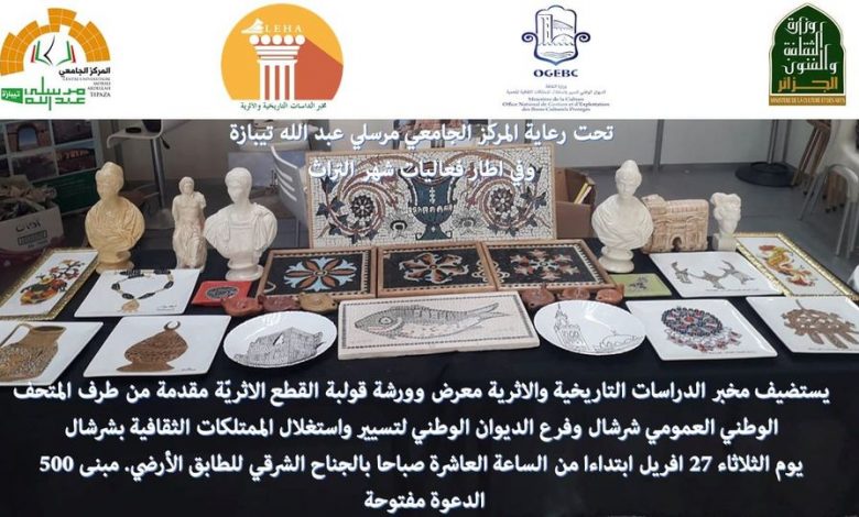 تحت رعاية المركز الجامعي مرسلي عبد الله تيبازة و في إطار شهر التراث يستضيف مخبر الدراسات التاريخية و الأثرية معرض وورشة قولبة القطع الأثرية مقدمة من طرف المتحف الوطني العمومي لشرشال و فرع الديوان الوطني لتسيير و إستغلال الممتلكات الثقافية بشرشال يوم الثلاثاء 27 أفريل إبتداء من الساعة 10 صباحا بالجناح الشرقي للطابق الأرضي مبنى 500