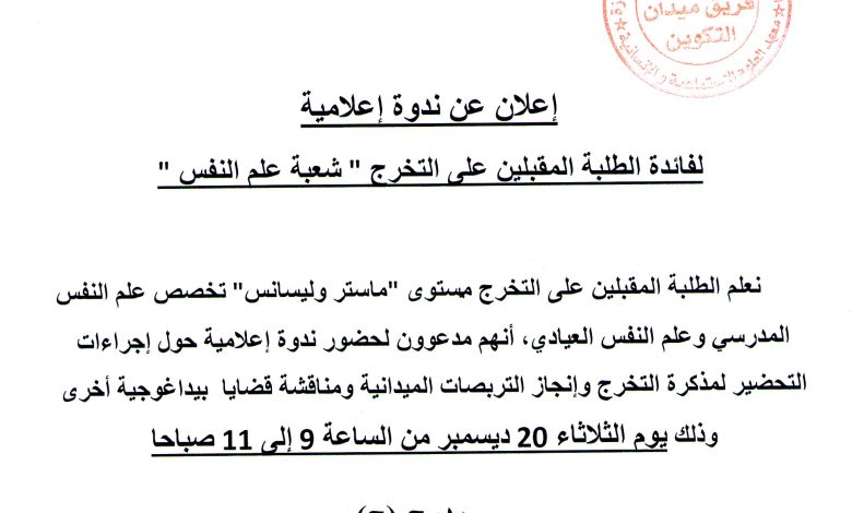 الرئيسية/إعلانات/ندوة إعلامية حول إجراءات التحضير لمذكرة التخرج وإنجاز التربصات الميدانية إعلاناتطلبة ندوة إعلامية حول إجراءات التحضير لمذكرة التخرج وإنجاز التربصات الميدانية 18 ديسمبر 2022 422 أقل من دقيقة 18 ديسمبر 2022 422 أقل من دقيقة اظهر المزيد شاركها فيسبوك تويتر لينكدإن مشاركة عبر البريد طباعة