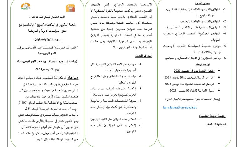 الرئيسية/Slider/يوم دكتورالي حول القوانين التعسفية الفرنسية أثناء الإحتلال وموقف الجزائريين منها Sliderأساتذةأيام دراسيةإعلاناتالتظاهرات العلمية للمخبرتظاهرات علميةطلبةمخبر الدراسات التاريخية و الأثرية يوم دكتورالي حول القوانين التعسفية الفرنسية أثناء الإحتلال وموقف الجزائريين منها 8 نوفمبر 2023 452 أقل من دقيقة 8 نوفمبر 2023 452 أقل من دقيقة اظهر المزيد شاركها فيسبوك تويتر لينكدإن مشاركة عبر البريد طباعة