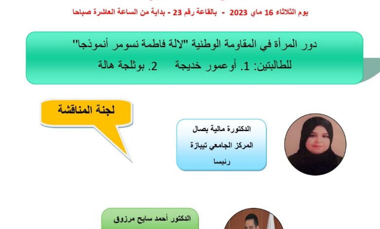 أكمل القراءة »تتشرف مديرة المكتبة الرئيسية للمطالعة العمومية آسيا جبار لولاية تيبازة بدعوة سيادتكم المحترمة لحضور اللقاء الأدبي :”كتاب وكتاب”الذي سيستضيف الدكتور…