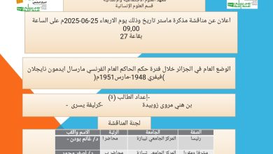 تم اليوم بتاريخ 25 جوان 2025 مناقشة أطروحة الدكتوراه تحت عنوان المعيقات التنظيمية والإجتماعية لنشاط مخابر البحث الجامعي…