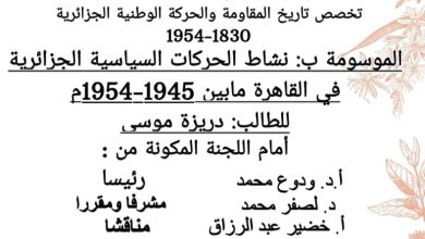 أول مناقشة تخصص ماستر تاريخ تحت عنوان نشاط الحركات السياسية الجزائرية في القاهرة مابين 1945-1954م