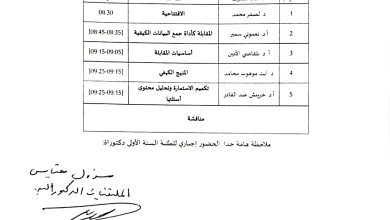 تنهي الأستاذة لنوار صبرينة إلى علم طلبة السنة أولى ماستر تاريخ المقاومة عن برمجة حصة إمتحان الأعمال الموجهة لمقياس…