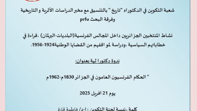 من فعاليات الملتقى الوطني اوطان متيجة الغربية والساحل. الأوضاع البشرية، الاقتصادية، الاجتماعية والسياسية 1830-1954 المنظم من طرف مخبر الدراسات التاريخية…