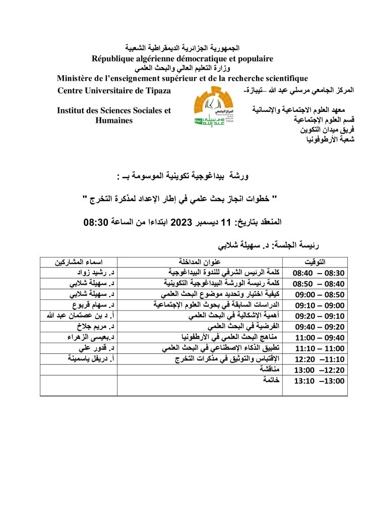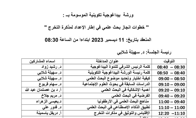 الرئيسية/Slider/ورشة بيداغوجية تكوينية موسومة ب: خطوات إنجاز بحث علمي في إطار الإعداد لمذكرة التخرج Sliderأساتذةأيام دراسيةإعلاناتطلبة ورشة بيداغوجية تكوينية موسومة ب: خطوات إنجاز بحث علمي في إطار الإعداد لمذكرة التخرج 10 ديسمبر 2023 580 أقل من دقيقة 10 ديسمبر 2023 580 أقل من دقيقة اظهر المزيد شاركها فيسبوك تويتر لينكدإن مشاركة عبر البريد طباعة