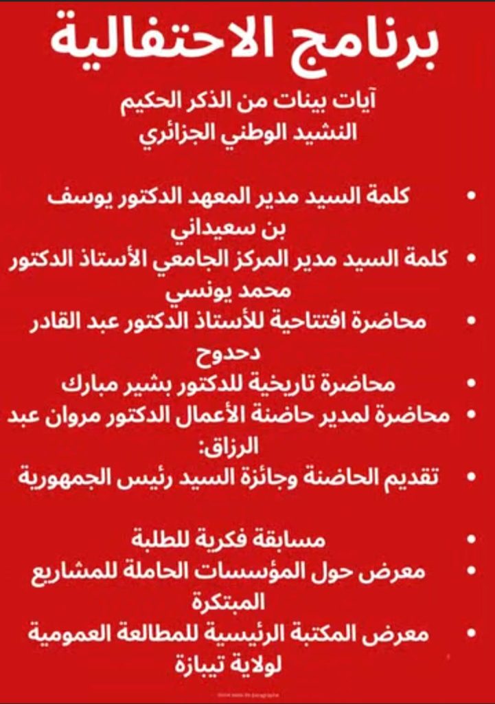 نظم معهد العلوم الإجتماعية والإنسانية اليوم 16 أفريل 2025  بالتنسيق مع حاضنة الأعمال للمركز الجامعي مرسلي عبد الله-تيبازة إحتفالا تخلله محاضرات ونشاطات ثقافية تمثلت في إنجازات النوادي الطلابية.