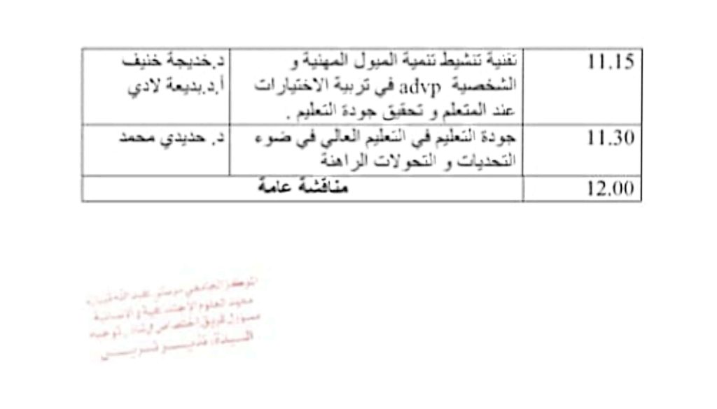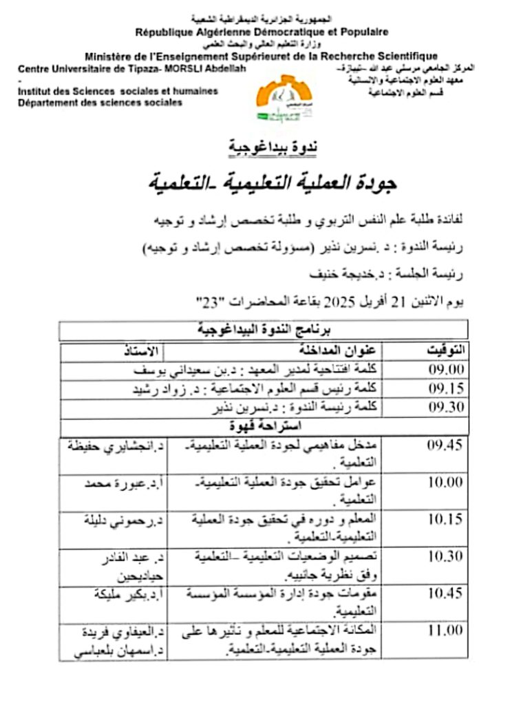 تم عقد ندوة بيداغوجية يوم الإثنين 21 أفريل 2025 تحت عنوان “جودة العملية التعليمية والتعلمية” لفائدة طلبة علم النفس التربوي وطلبة تخصص إرشاد وتوجيه تحت رئاسة الدكتورة نذير نسرين والدكتورة خنيف خديجة.