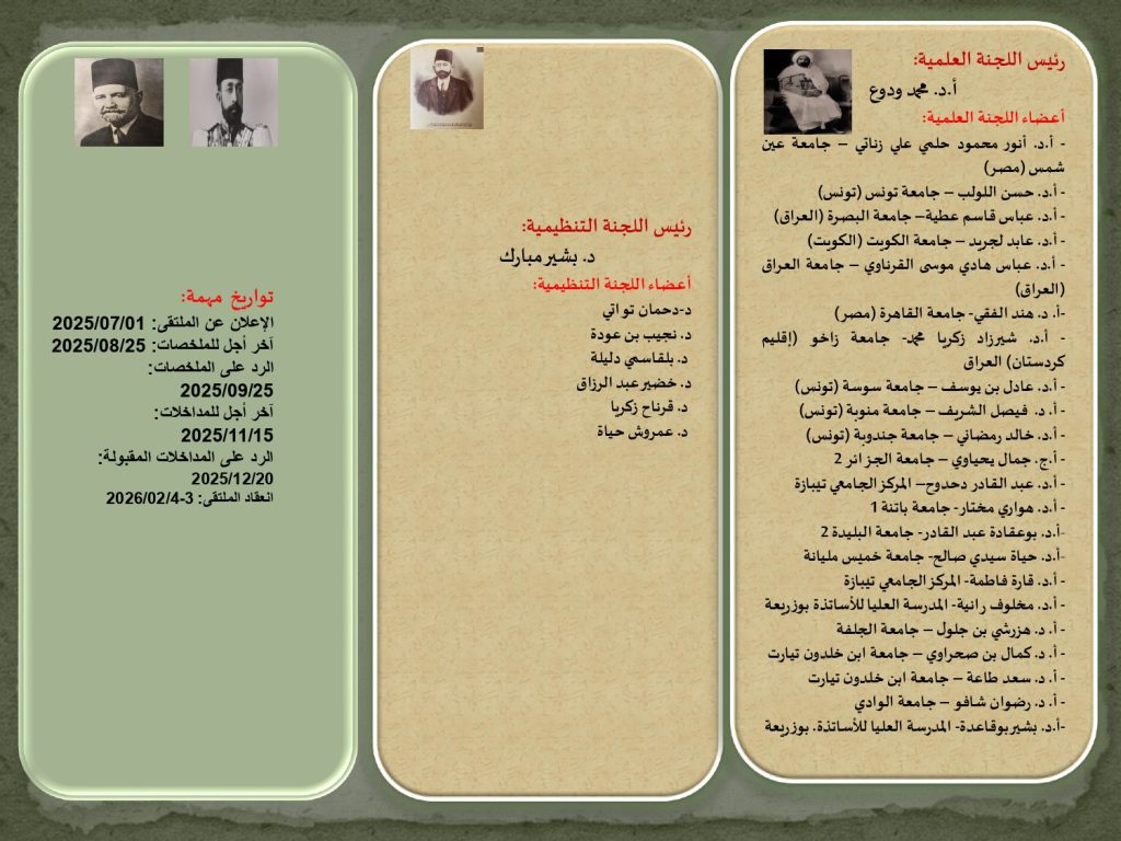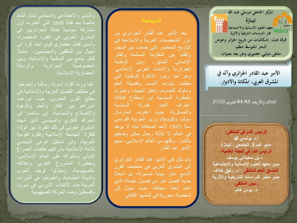 يتشرف مخبر الدراسات التاريخية والأثرية بالمركز الجامعي مرسلي عبد الله –تيبازة بدعوة الباحثين (أساتذة وطلبة دكتوراه) من داخل الوطن وخارجه للمشاركة في الملتقى الدولي الموسوم ب“الأمير عبد القادر وآله في المشرق العربي، المكانة والأدوار”.