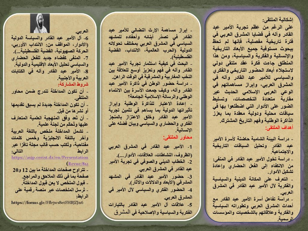 الملتقى الدولي الموسوم ب”الأمير عبد القادر وآله في المشرق العربي، المكانة والأدوار”