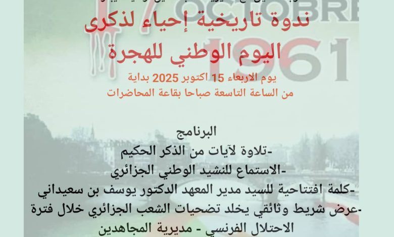 الرئيسية/Slider/قسم العلوم الانسانية بالتعاون مع شعبة التاريخ وبالتنسيق مع مديرية المجاهدين لولاية تيبازة يعلن عن تنظيم ندوة تاريخية إحياءا لذكرى اليوم الوطني للهجرة Sliderأساتذةأيام دراسيةإعلاناتتظاهرات علميةطلبة قسم العلوم الانسانية بالتعاون مع شعبة التاريخ وبالتنسيق مع مديرية المجاهدين لولاية تيبازة يعلن عن تنظيم ندوة تاريخية إحياءا لذكرى اليوم الوطني للهجرة 14 أكتوبر 2025 666 أقل من دقيقة 14 أكتوبر 2025 666 أقل من دقيقة اظهر المزيد شاركها فيسبوك تويتر لينكدإن مشاركة عبر البريد طباعة