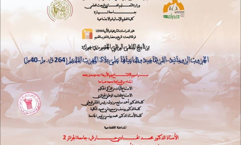 تتشرف جامعة تيبازة ، ممثلة في كلية العلوم الإنسانية والاجتماعية ومخبر الدراسات التاريخية والأثرية LEHA، بدعوتكم لحضور أشغال الملتقى الوطني الهام الموسوم بـ: الحروب الرومانية القرطاجية و تداعيتها على بلاد المغرب القديم-264ق.م،40م- تحت رئاسة الدكتور سايح مرزوق أحمد.