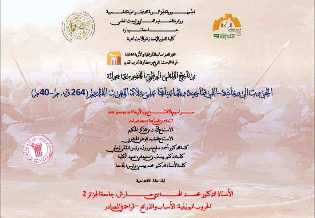 تتشرف جامعة تيبازة ، ممثلة في كلية العلوم الإنسانية والاجتماعية ومخبر الدراسات التاريخية والأثرية LEHA، بدعوتكم لحضور أشغال الملتقى الوطني الهام الموسوم بـ: الحروب الرومانية القرطاجية و تداعيتها على بلاد المغرب القديم-264ق.م،40م- تحت رئاسة الدكتور سايح مرزوق أحمد.