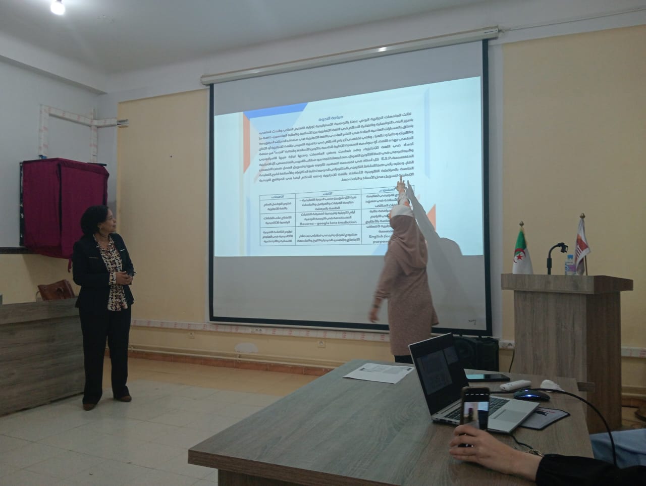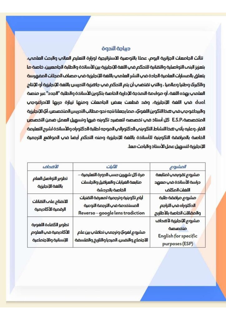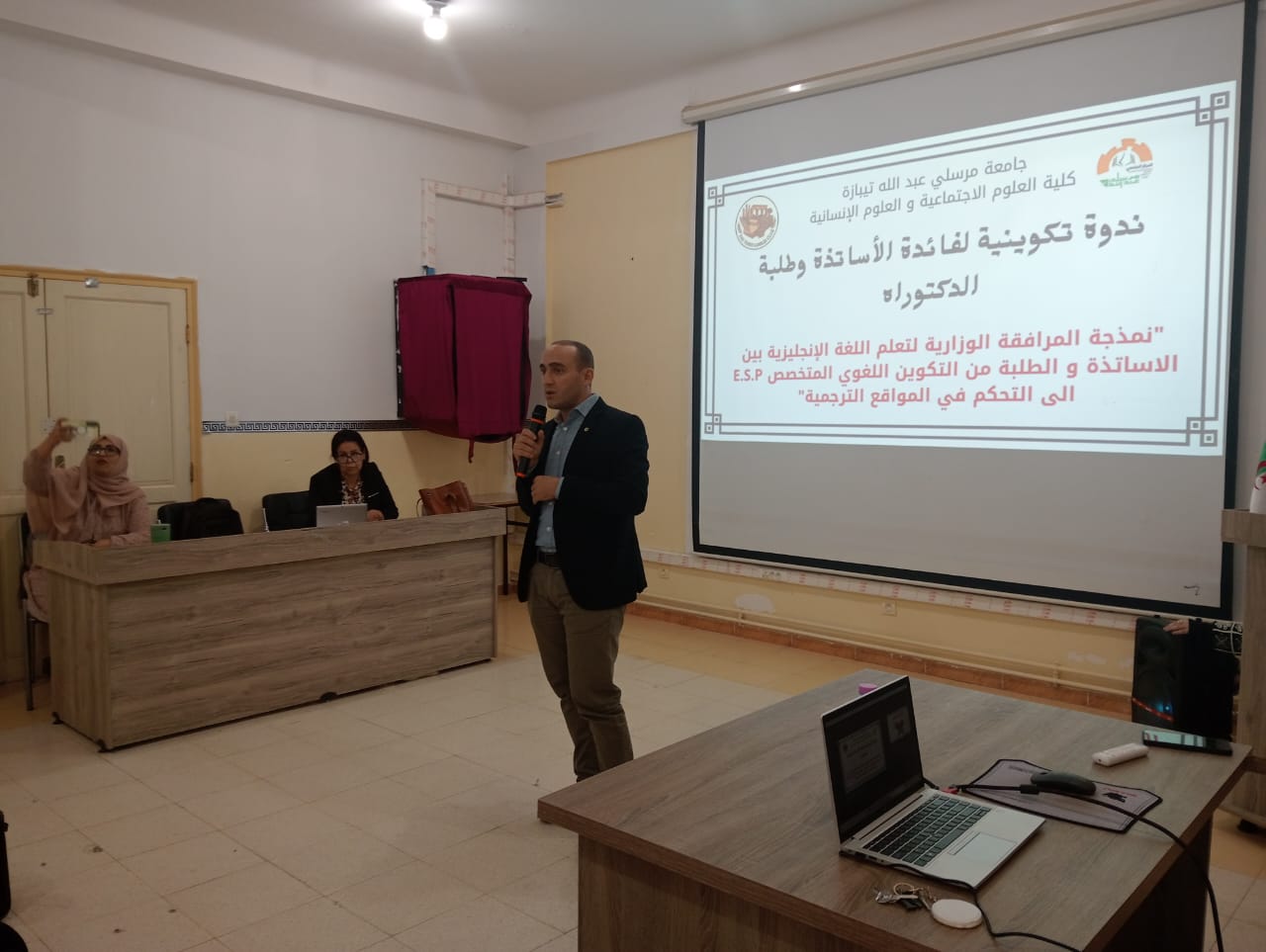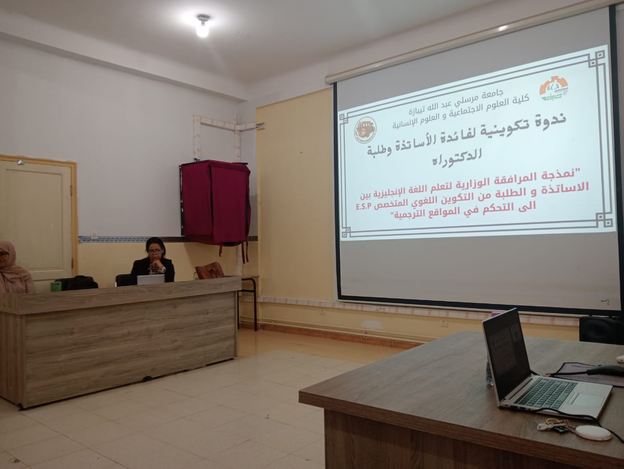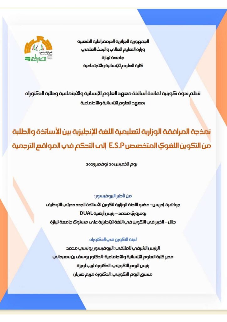 نظمت كلية العلوم الاجتماعية والإنسانية ندوة تكوينية لفائدة الأساتذة وطلبة الدكتوراه بخصوص نمذجة المرافقة الوزارية لتعليمية اللغة الإنجليزية بين الأساتذة والطلبة من التكوين اللغوي المتخصص E.S.P إلى التحكم في المواقع الترجمية.