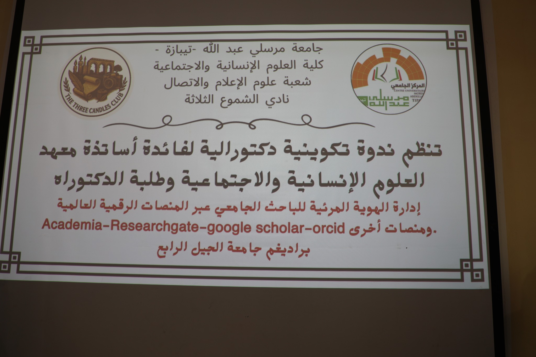 كلية العلوم الإنسانية والإجتماعية تنظم ندوة دكتورالية بعنوان إدارة الهوية المرئية للباحث الجامعي عبر المنصات الرقمية العالمية من تنشيط البروفيسور عبد القادر دواوي .