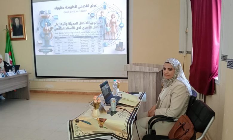 تشرفت كلية العلوم الإنسانية والإجتماعية اليوم 07 أفريل 2026 بمناقشة أطروحة الدكتوراه للطالبة براهمي سعيدة تخصص علم اجتماع الإتصال تحت عنوان: تكنولوجيا الإتصال الحديثة وأثرها على الإتصال الأسري لدى الستاذ الجامعي-دراسة ميدانية بكلية العلوم الإنسانية والإجتماعية بجامعة تبسة- تحت إشراف الدكتور خريبش عبد القادر.