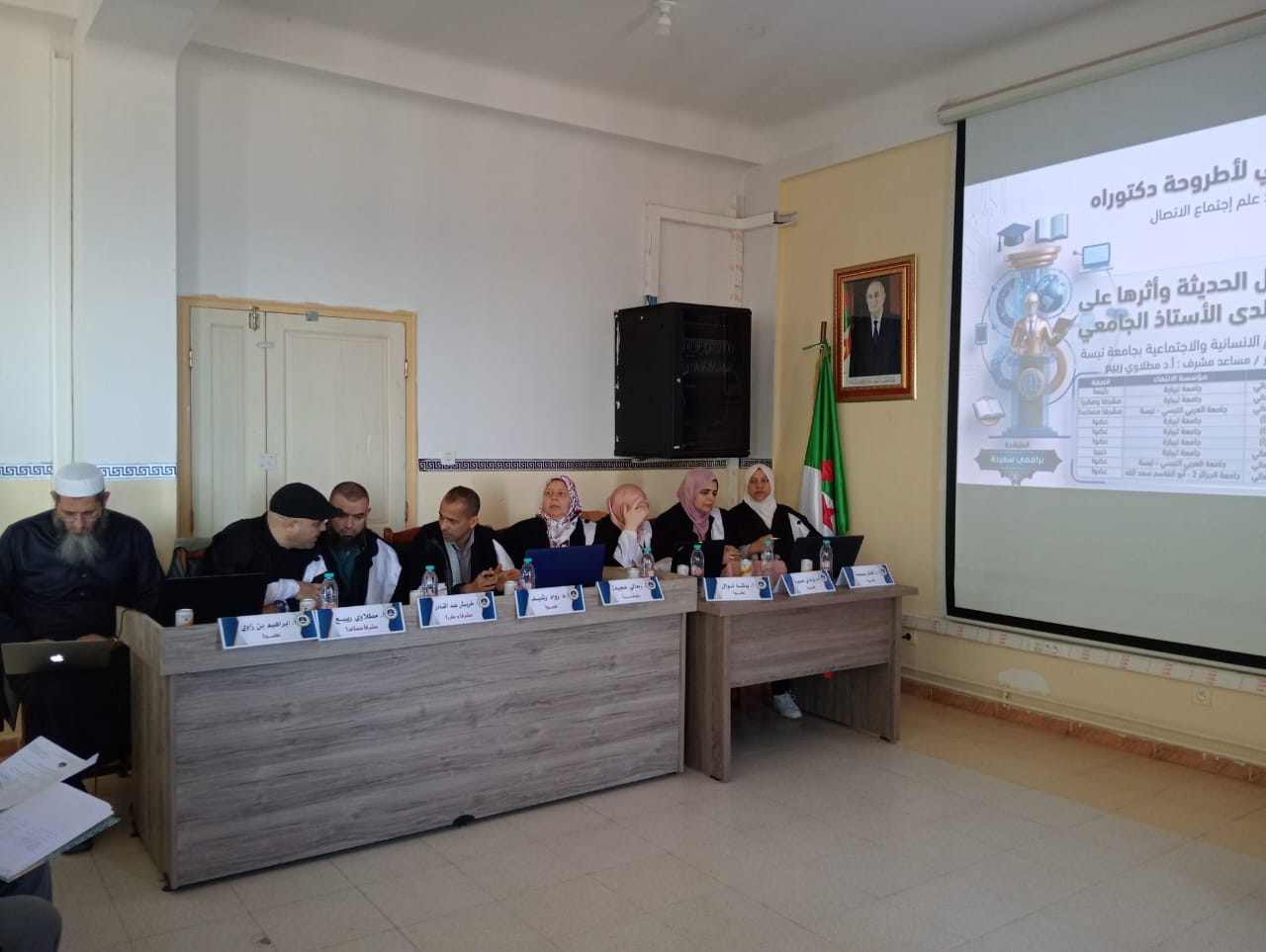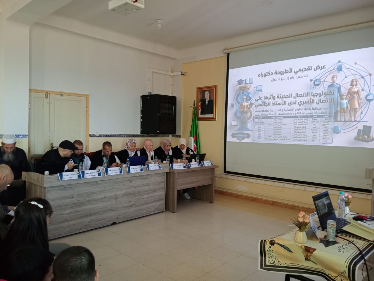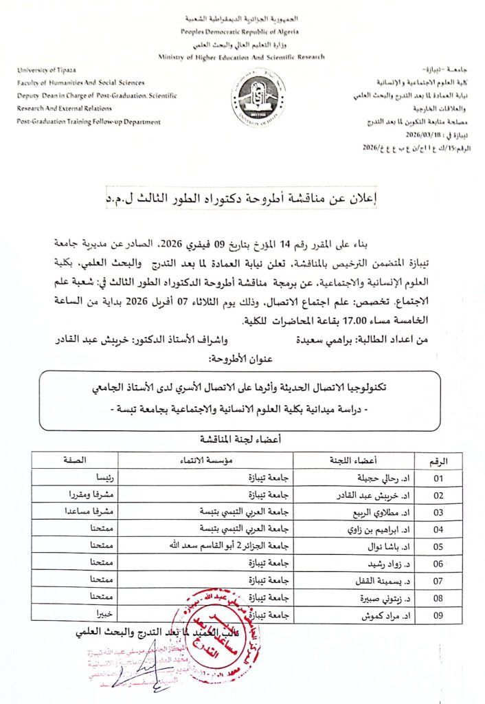 تشرفت كلية العلوم الإنسانية والإجتماعية اليوم 07 أفريل 2026 بمناقشة أطروحة الدكتوراه للطالبة براهمي سعيدة تخصص علم اجتماع الإتصال تحت عنوان: تكنولوجيا الإتصال الحديثة وأثرها على الإتصال الأسري لدى الستاذ الجامعي-دراسة ميدانية بكلية العلوم الإنسانية والإجتماعية بجامعة تبسة- تحت إشراف الدكتور خريبش عبد القادر.