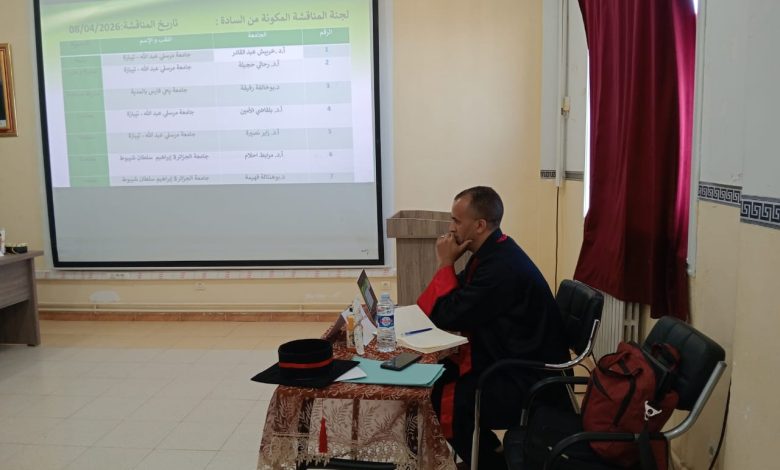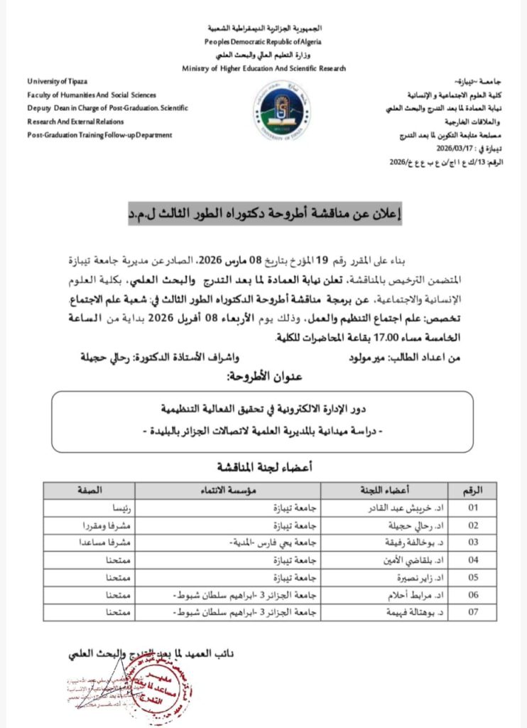 تم اليوم 08 أفريل 2026مناقشة أطروحة الدكتوراه للطالب مير مولود تخصص علم اجتماع التنظيم والعمل تحت عنواندور الإدارة الإلكترونية في تحقيق الفعالية التنظيمية –دراسة ميدانية بالمديرية العلمية لإتصالات الجزائر بالبليدة-تحت إشراف الدكتورة رحالي حجيلة.