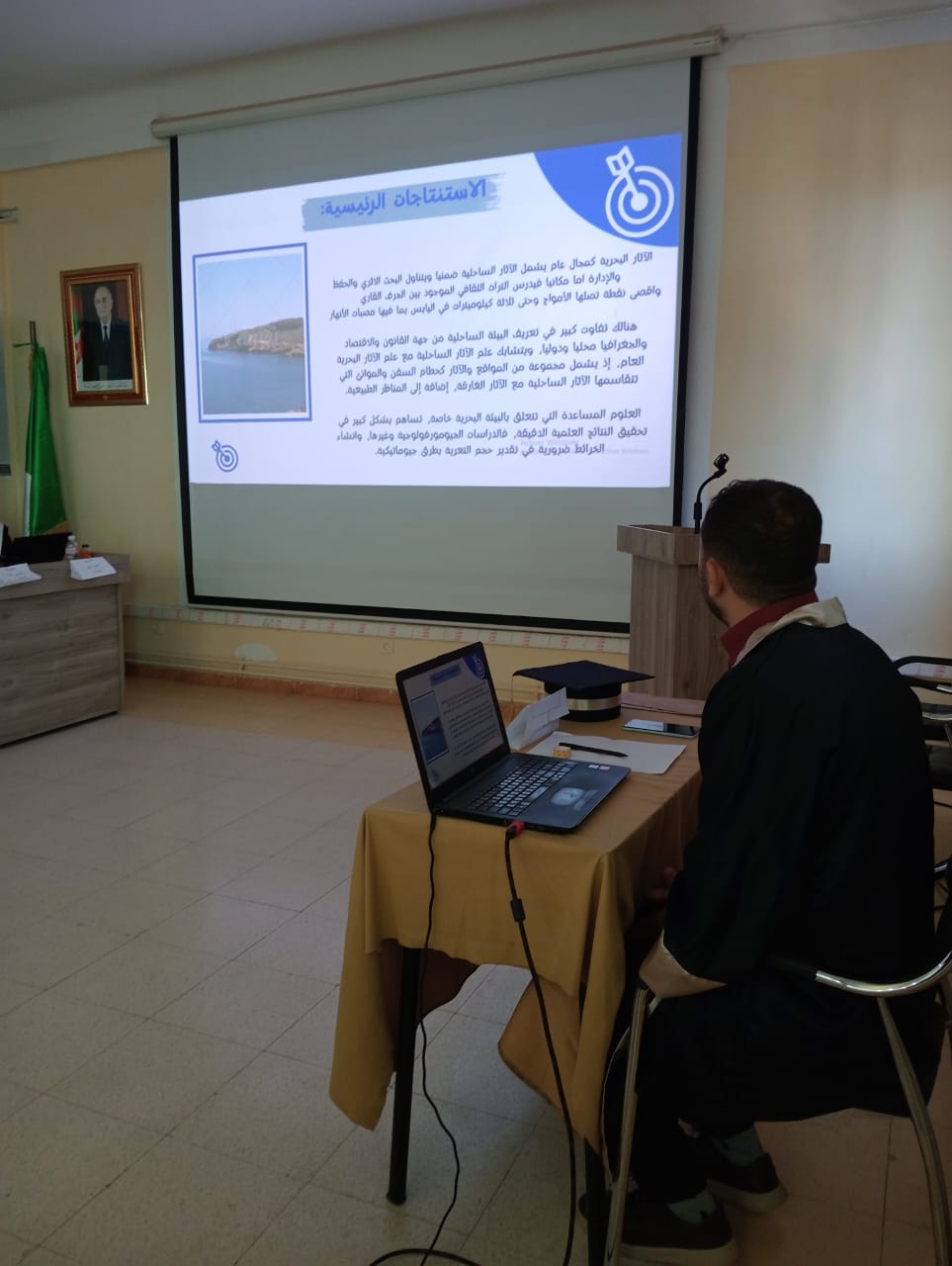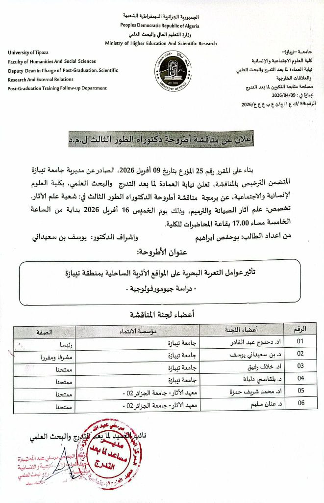مناقشة أطروحة الدكتوراه تخصص علم أثار الصيانة والترميم تحت عنوان: تأثير عوامل التعرية الساحلية بمنطقة تيبازة-دراسة جيومورفولوجية